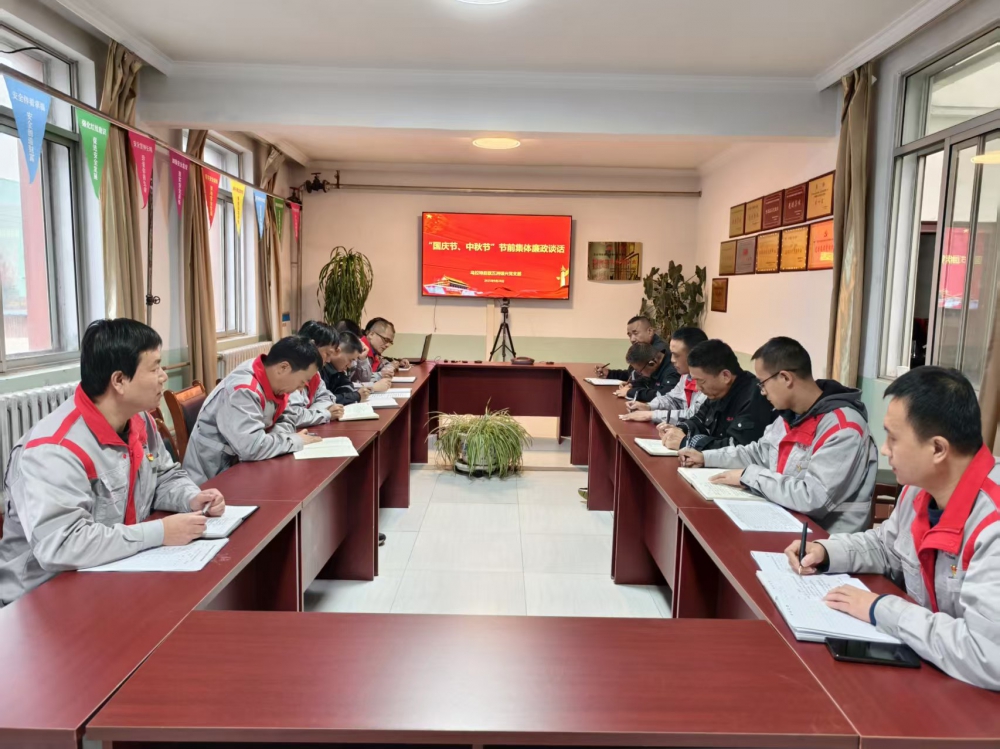為進一步加強黨風廉政建設,營造風清氣正的節日氛圍,9月28日,內蒙項目部組織開展中秋、國慶雙節前集體廉政談話會。會議由公司黨支部副書記、紀檢員張育波主持,公司黨支部副書記、經理史小亮作總結講話,公司領導班子成員及各部室負責人參加會議。